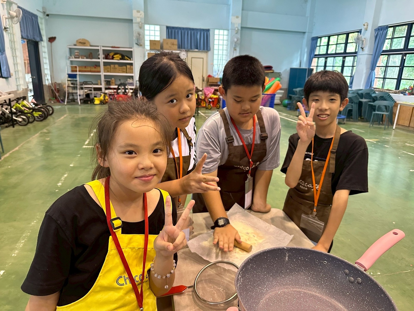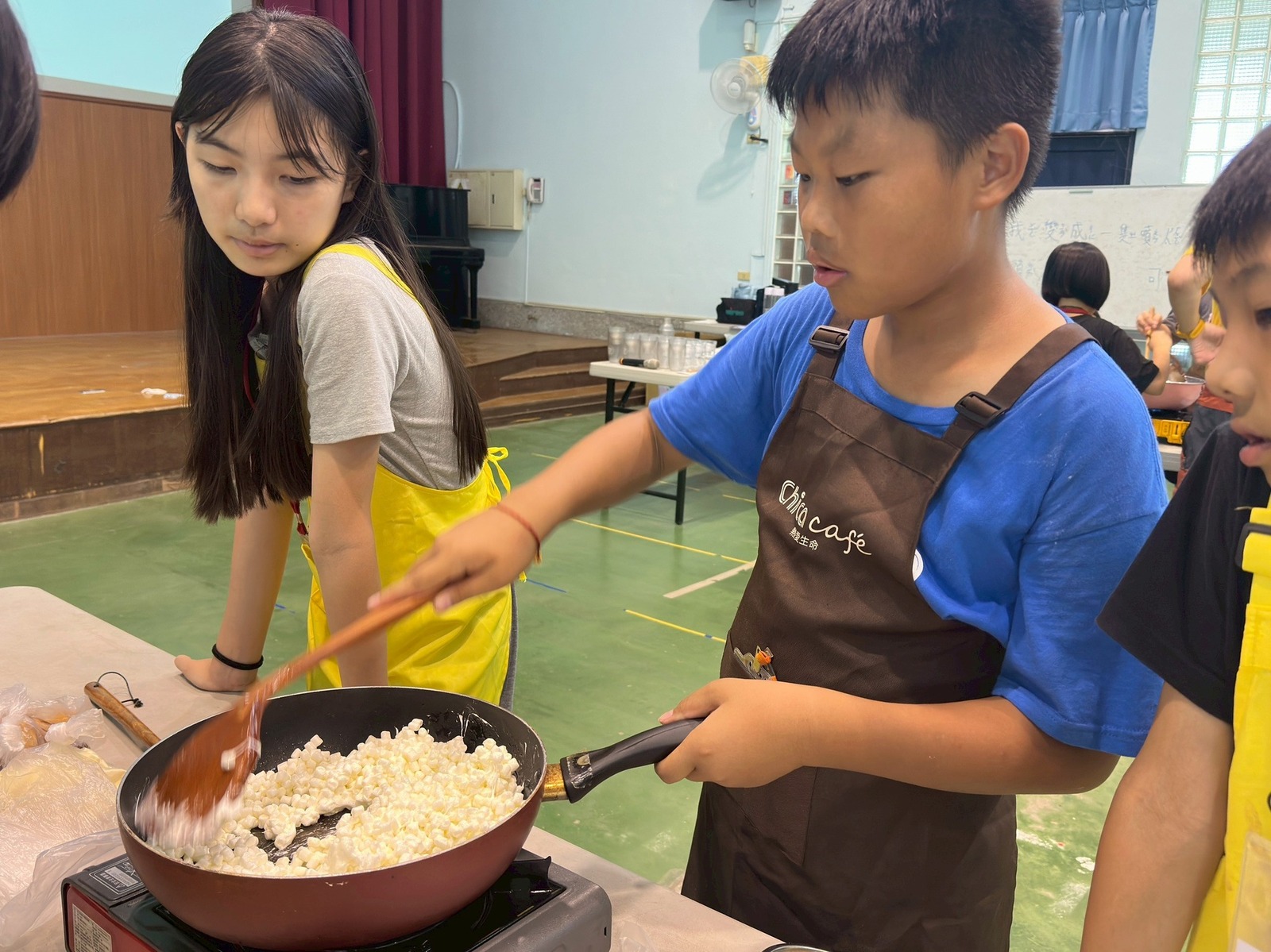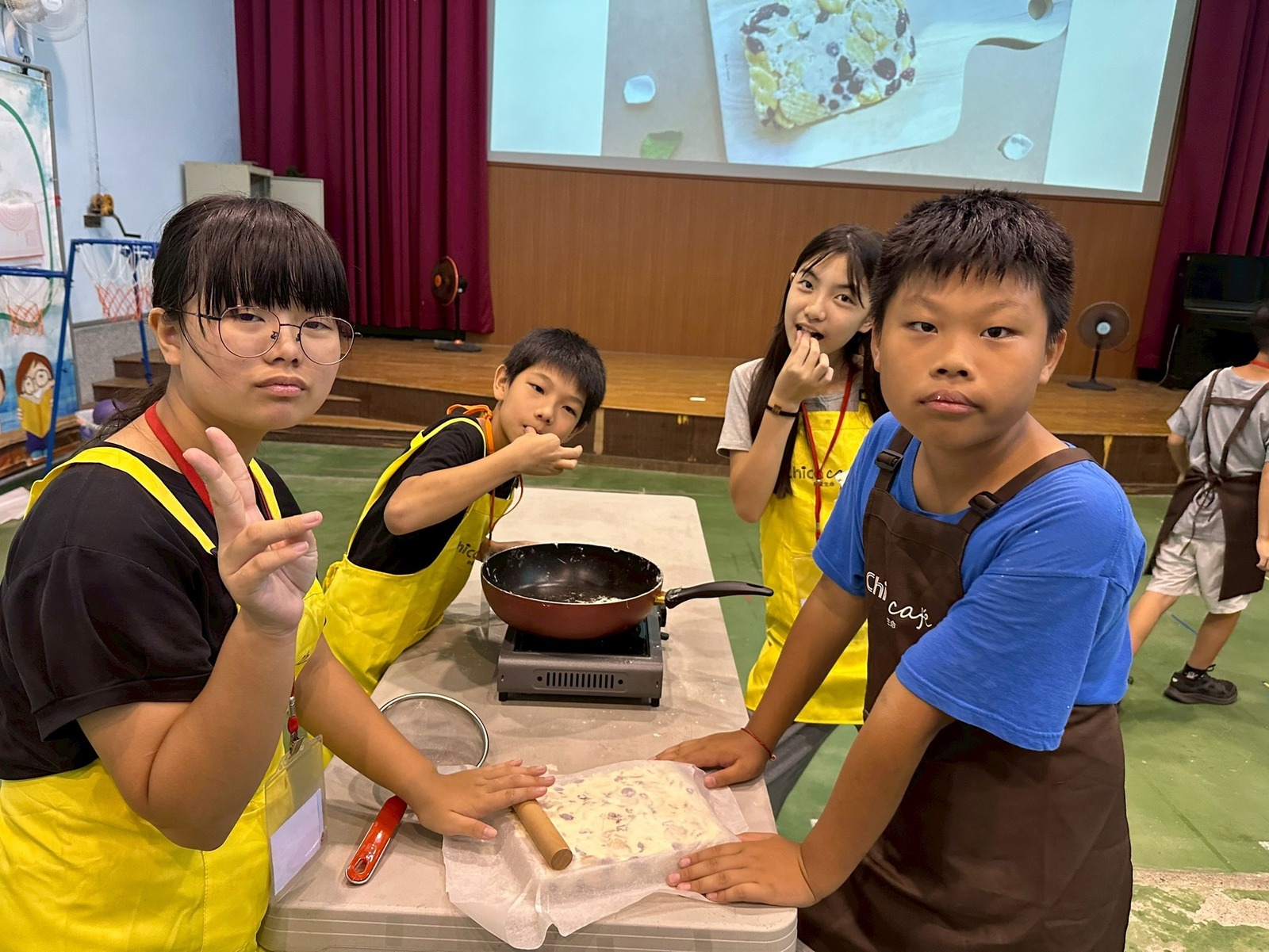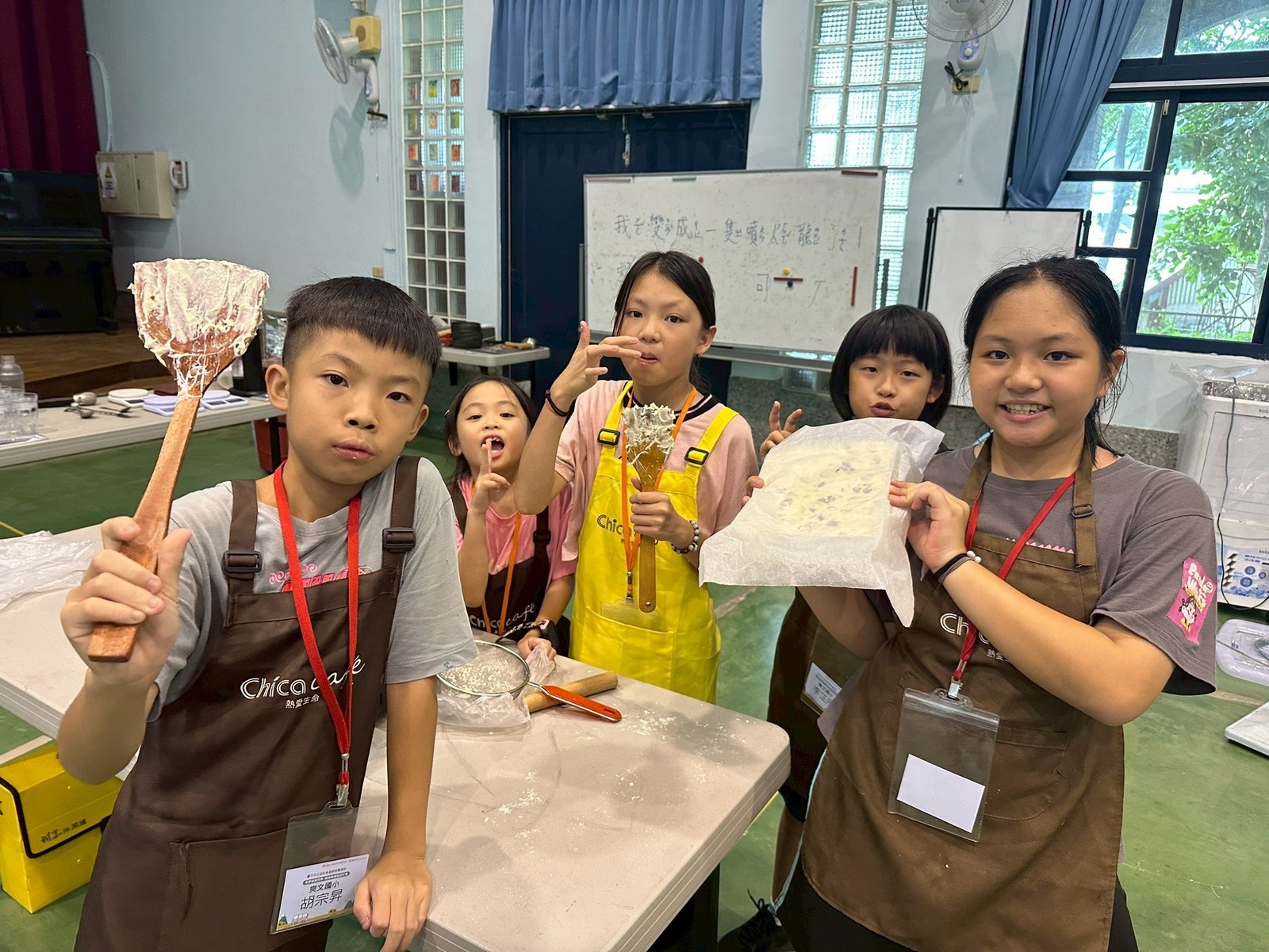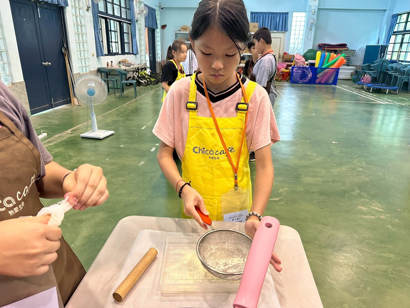 孩子們的笑容就像陽光一樣燦爛,期待著今天的手作體驗。我們先從雪Q餅開始動手做起,從下料、攪拌、壓模到包裝,每一個步驟都考驗著小朋友的專注力與團隊合作。當香氣瀰漫整個活動中心、甜甜的雪Q餅完成時,那份成就感比糖還甜。![]()