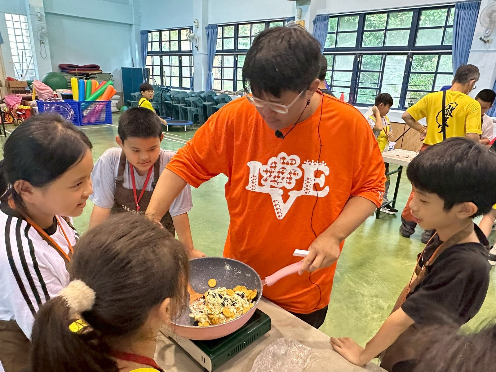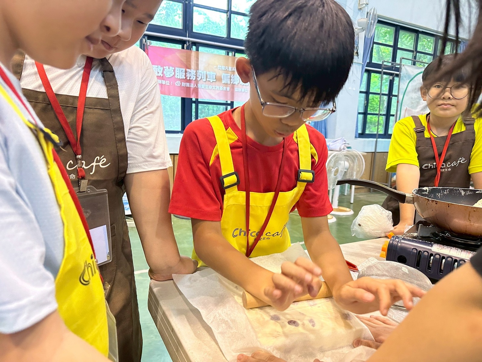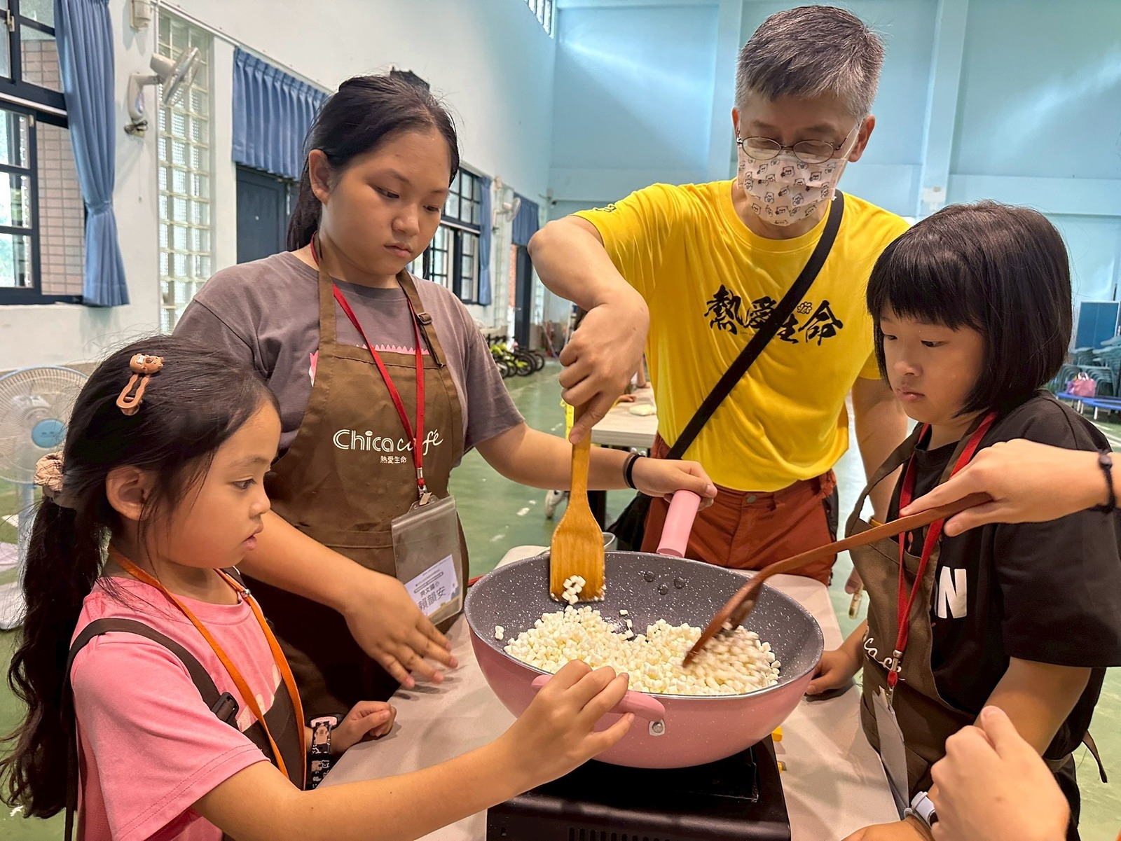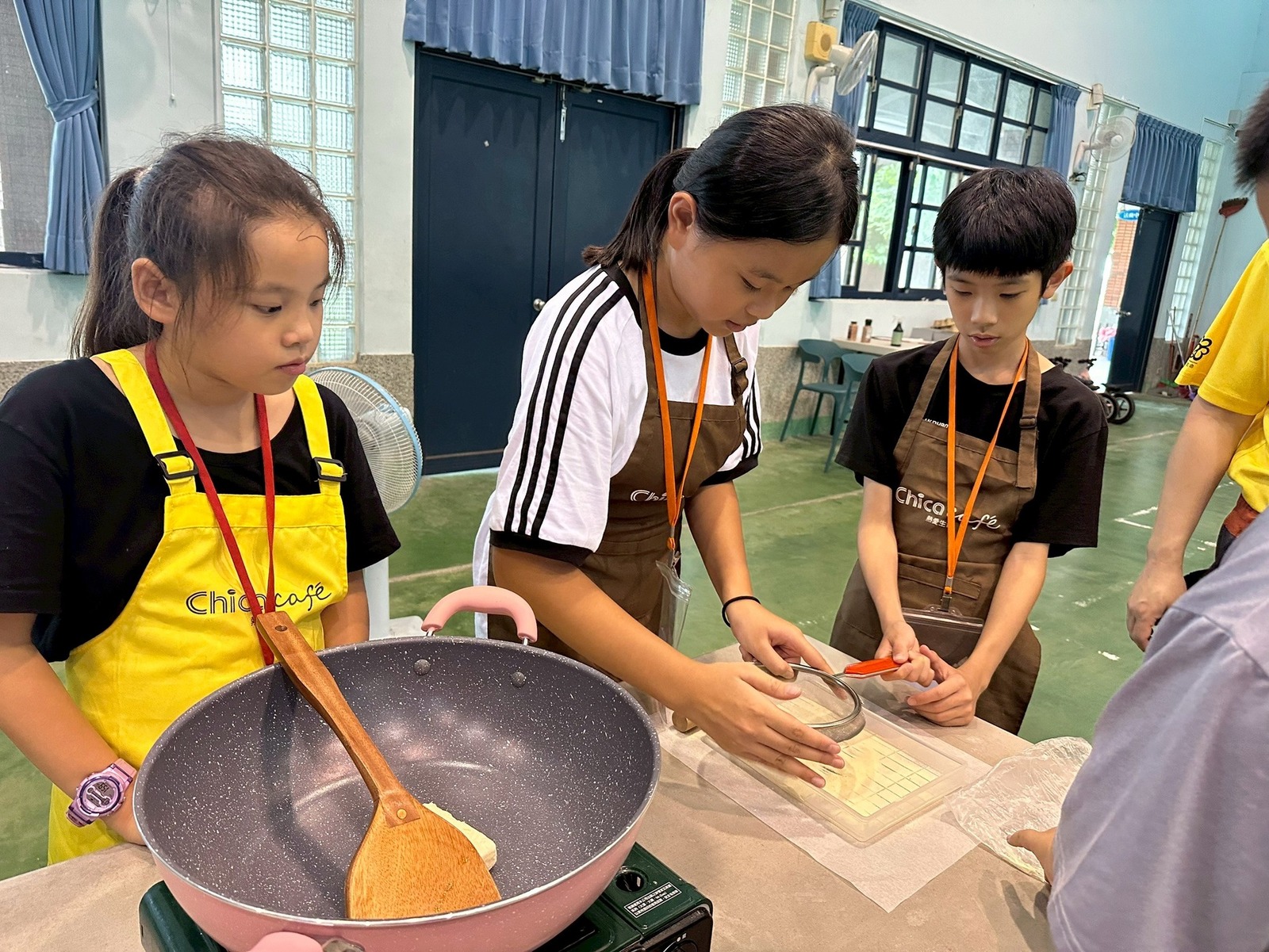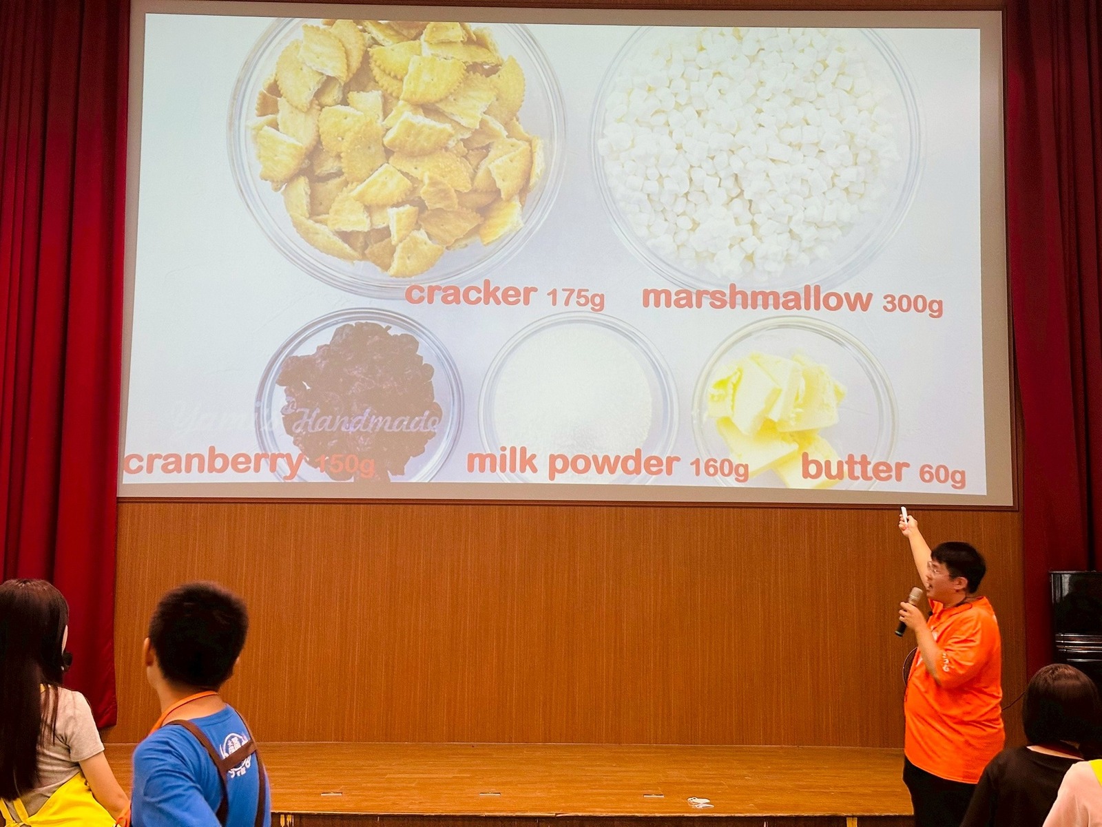 孩子們的笑容就像陽光一樣燦爛,期待著今天的手作體驗。我們先從雪Q餅開始動手做起,從下料、攪拌、壓模到包裝,每一個步驟都考驗著小朋友的專注力與團隊合作。當香氣瀰漫整個活動中心、甜甜的雪Q餅完成時,那份成就感比糖還甜。![]()