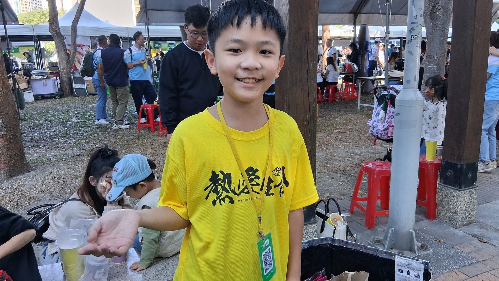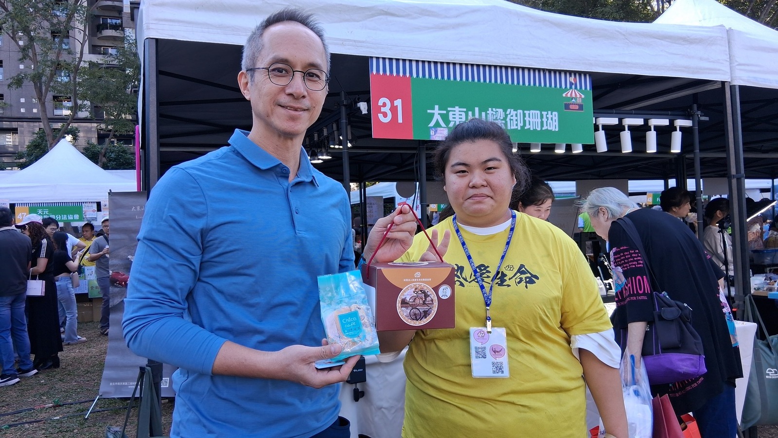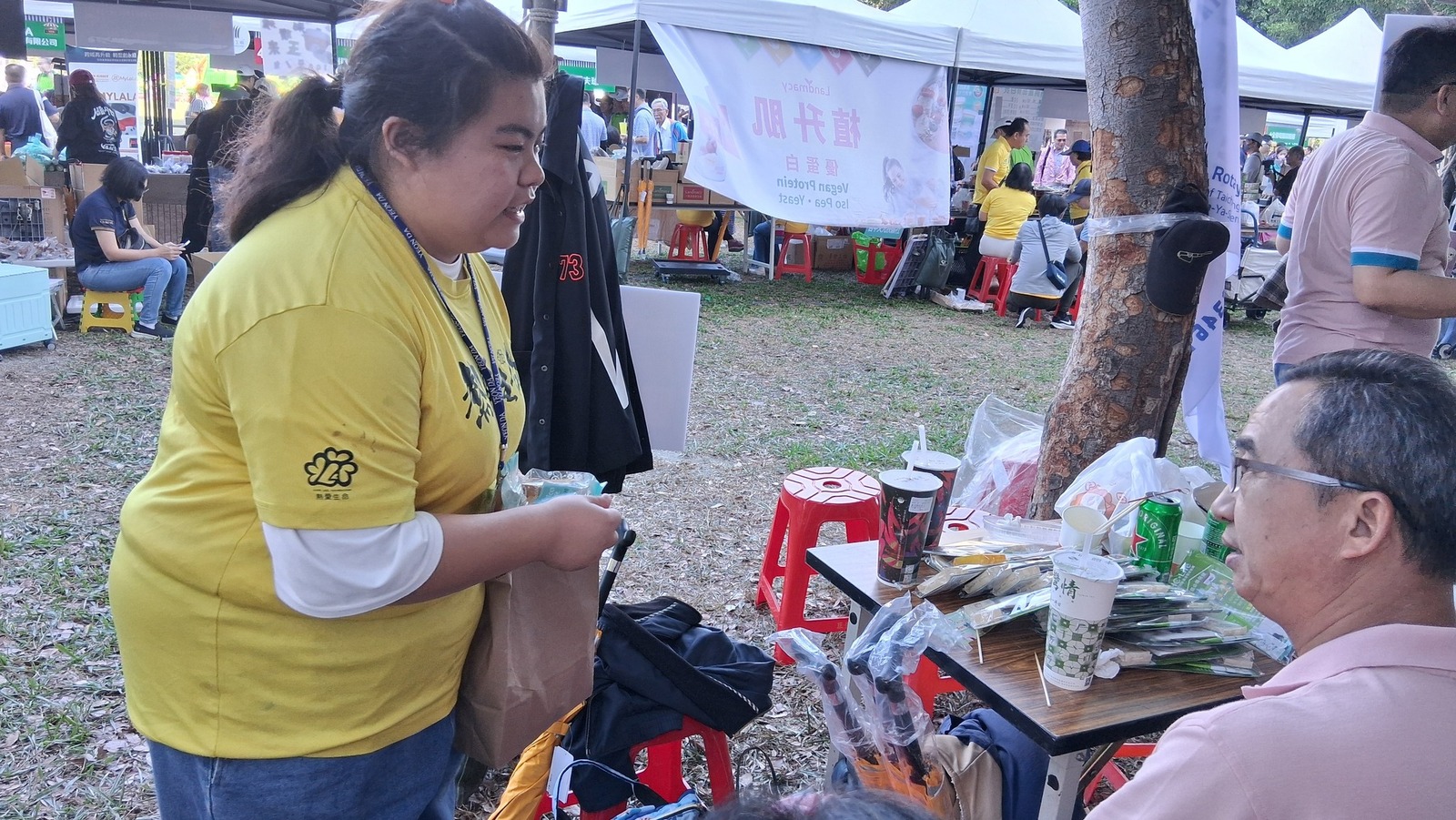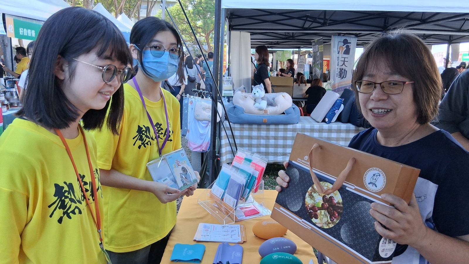 在公益義賣的攤位上努力介紹、努力推廣,