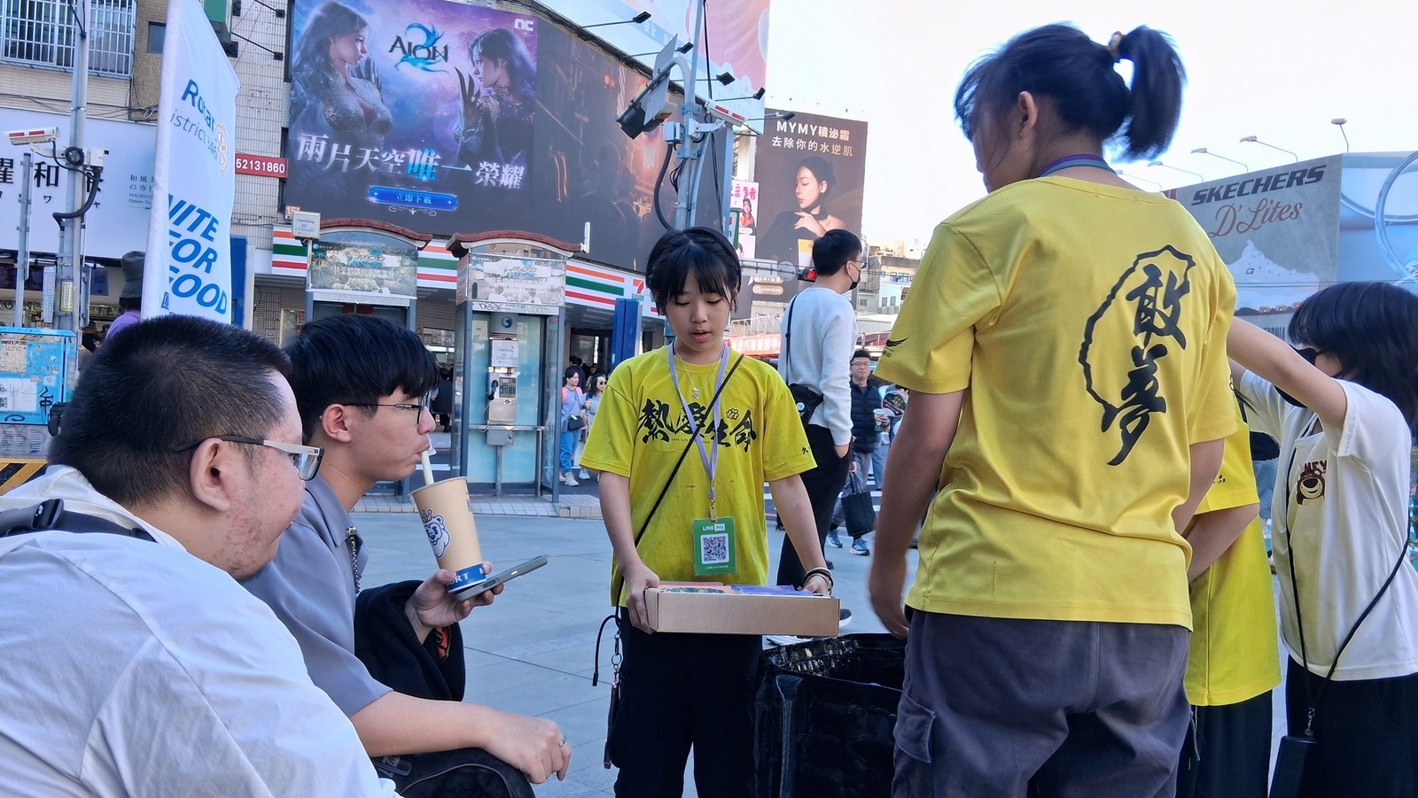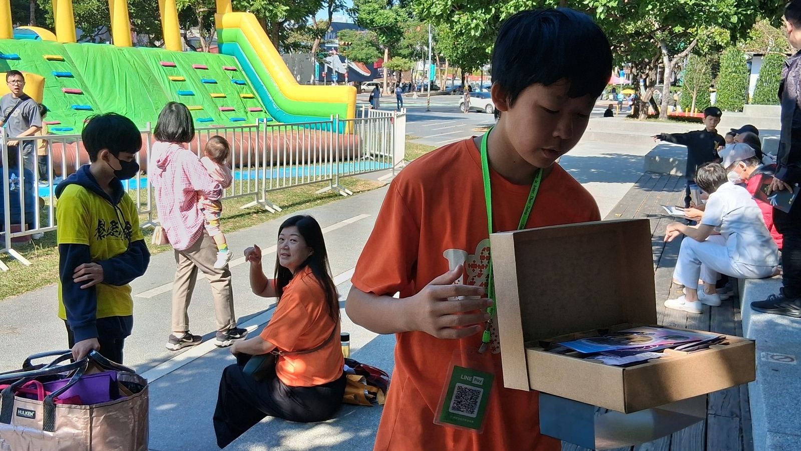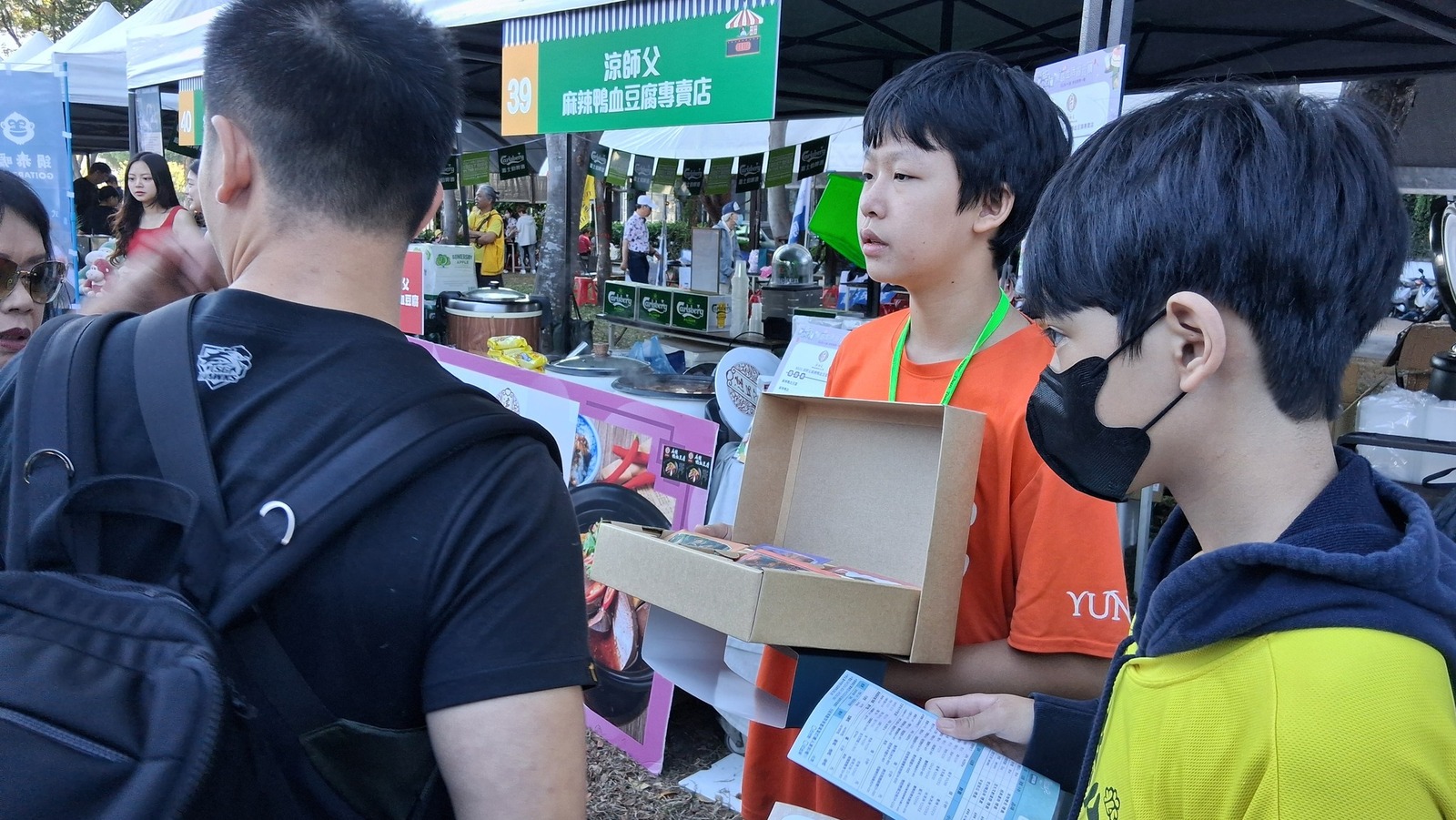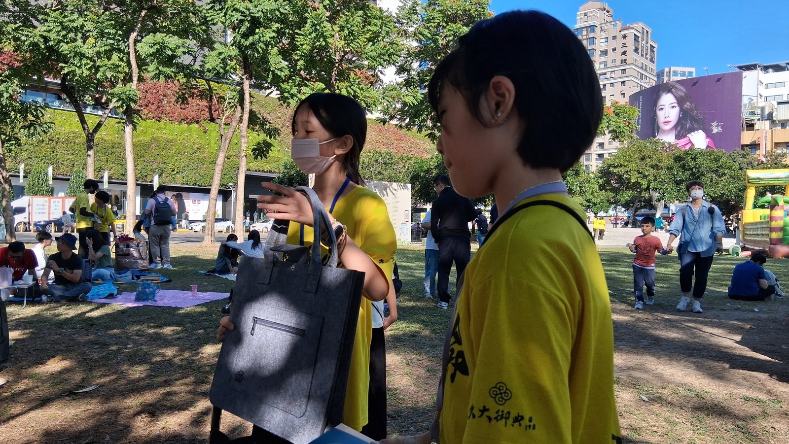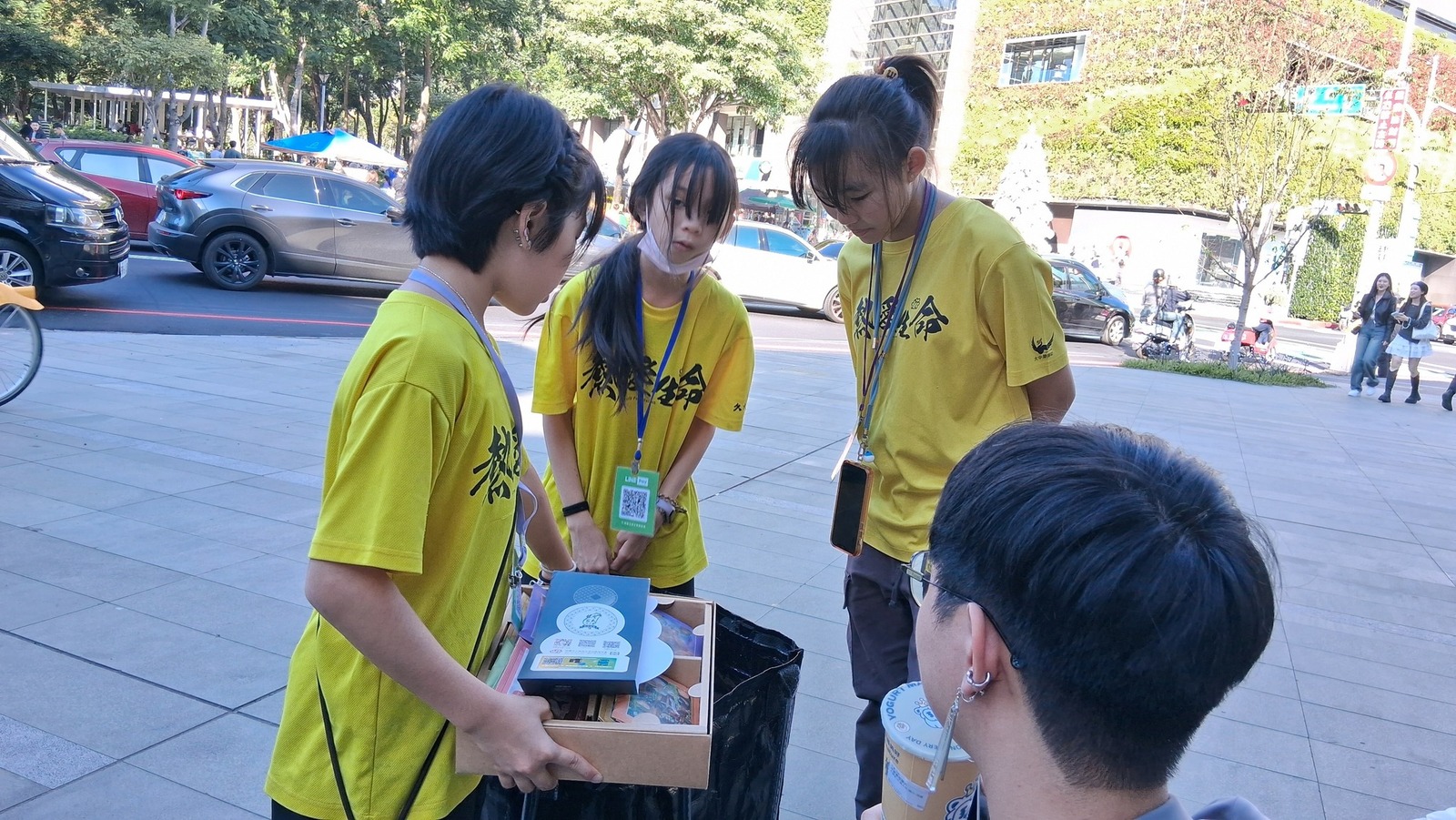 在公益義賣的攤位上努力介紹、努力推廣,