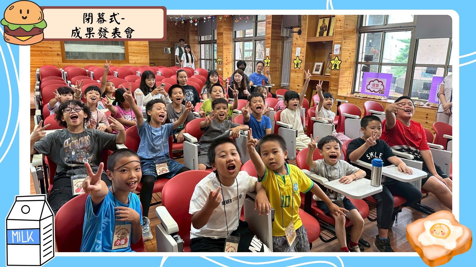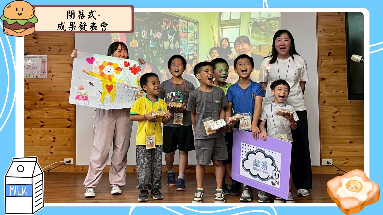 。各組輪番上台介紹自己的早餐店logo,自信滿滿,創意十足,還帶來了整齊有活力的營歌表演,讓在場的老師與貴賓不斷鼓掌